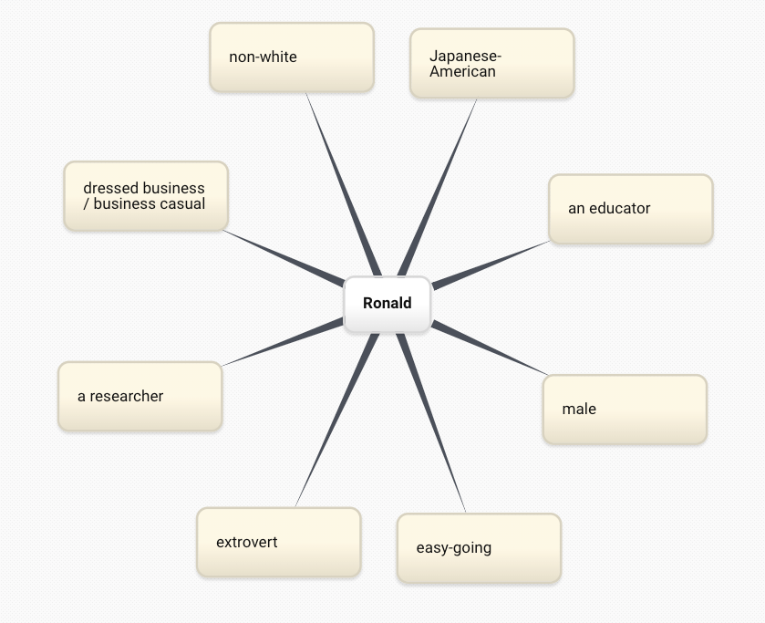 Now that we know what makes up one’s identity, we read a short story or passage or article that describes, in some way, a person or character. (Some examples of this could be a piece of nonfiction, a fictional short story, or even a short bio from a sports magazine - the possibilities are endless!) The last few times I’ve done this with my class I’ve used the first page or so from A Different Mirror (Takaki, 1994). As my students read this short passage, I ask them to compose an identity map of the narrator and main character Ronald.